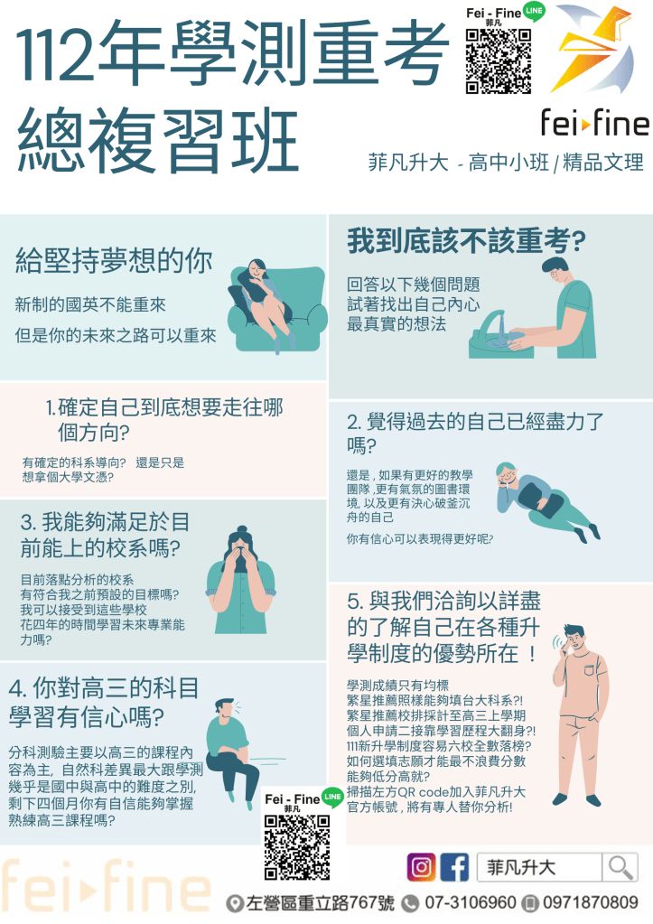 後記: 菲凡升大 從頭到尾 沒有打過一通招生電話 從來不急催學生報名 沒有發過任何試聽獎金 更沒有三科五千 開學馬上收30倍學費綁學生的花招 我們有的 只有紮紮實實的教學實力 讓我們敢堅持十年 堅持不開國中部 沒有招生班底也不怕 堅持不打招生電話 沒有死纏不放的話術 堅持維持正常學費 沒有騙進去就狂漲回本的騙術 感謝這些優秀的同學 沒有為了跟同學玩去站前 沒有為了微薄獎金去站前 沒有因為被死纏爛打去站前 沒有只想找個地方混去站前 因為有你們 我們才能做到各校前三 因為有你們 我們才能堅持教學至上十年 因為有你們 我們才會一直是北高雄 榜單無人能比的高中專業小班