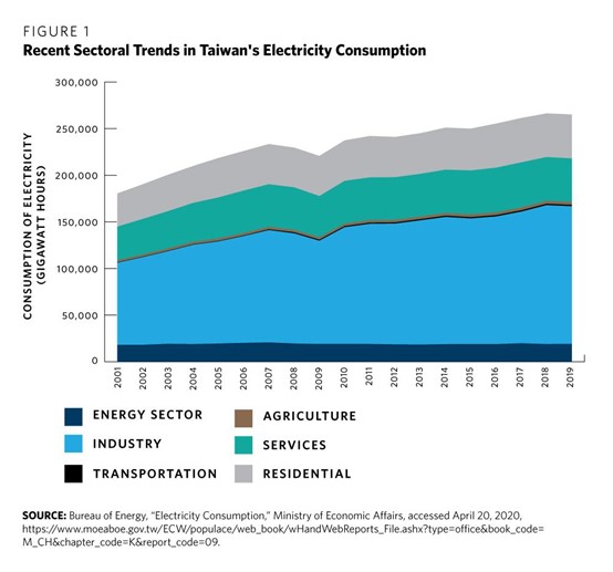 Taiwan especially needs additional energy storage and gas-fired generation capacity, as well as further price rationalization reforms to its power market. One reason is that Taiwan’s electricity consumption continued to rise at a rate of 1.76 percent per year from 2004 to 2019, with industrial consumption making up 56 percent of the total in 2019, the largest share among all sectors.10 And Taiwan’s gross electricity generation increased by 14 percent between 2005 and 2015, from 227 terawatt hours (TWh) to more than 258 TWh (see figure 1).11