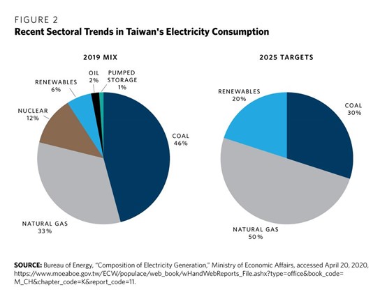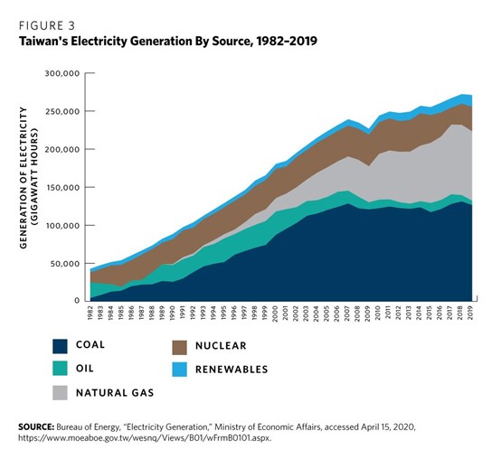 Happily, the reserve margin of power improved to 16.8 percent in 2019.6 Indeed, one reason for the low reserve margin prior to 2018 was that Taiwan’s fourth nuclear power plant had been scheduled to begin operating in 2014 or 2015 but was instead sealed in 2014. Reserve margins have gradually improved since the commissioning of coal-fired units in Linkuo and Dalin and the gas-fired unit in Tongxiao.