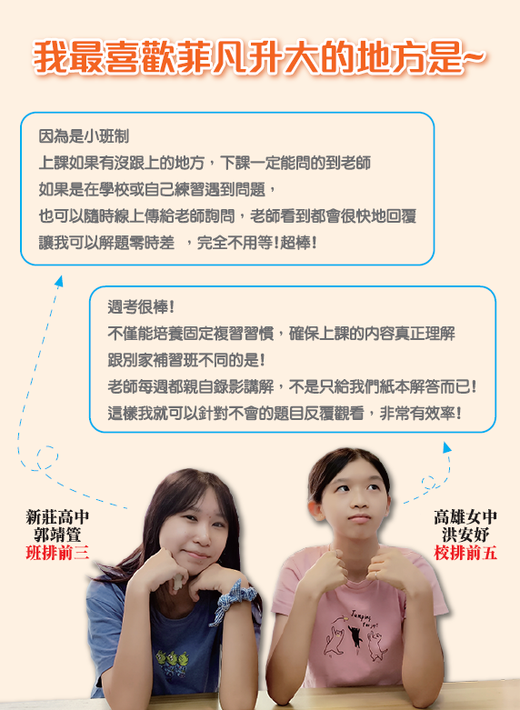 在家附近的小班,讓同學不管平假日都能輕鬆來班上課,不用放學趕車或週末早起跋涉到火車站前。菲凡升大精心打造媲美咖啡廳讀書環境,讓同學不僅課餘時間就近來班念書,有問題隨時都可以來班找老師輔導解題!