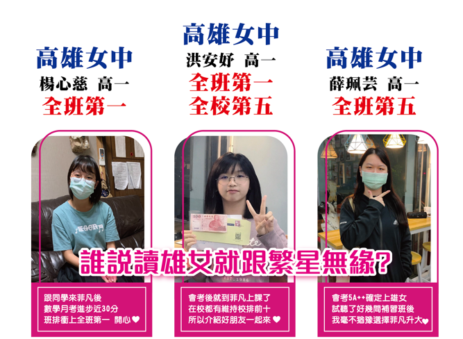 Glory wall of KSHS&KGHS 1112學年度 菲凡升大學員 雄中雄女榮譽牆 誰說讀雄中雄女就不用在乎校排? 112年高一 雄中雄女班班排前三的比率為 80 %班排前五則為 100% !!!! 不論在哪個高中 只要用正確的方法學習都能夠輕鬆高分 獨占鰲頭 ! 113年新高一課表 113年升高二課表 113年學測複習課表 分享此文: 分享到 X(在新視窗中開啟) X 分享到 Facebook(在新視窗中開啟) Facebook 喜歡 正在載入...